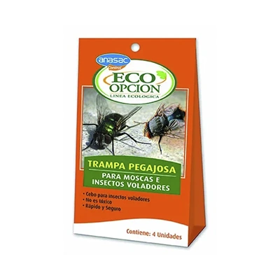 La Trampa Pegajosa Para Insectos Voladores Anasac es un dispositivo adhesivo diseñado para la captura de moscas y otros insectos voladores en ambientes con alta carga de infestación. Cuenta con un cebo especialmente atrayente, sin ingredientes químicos, no tóxico y de uso sencillo. Su formato incluye un rollo adhesivo que se extrae mediante un cordón rojo; luego se fija en la superficie deseada.