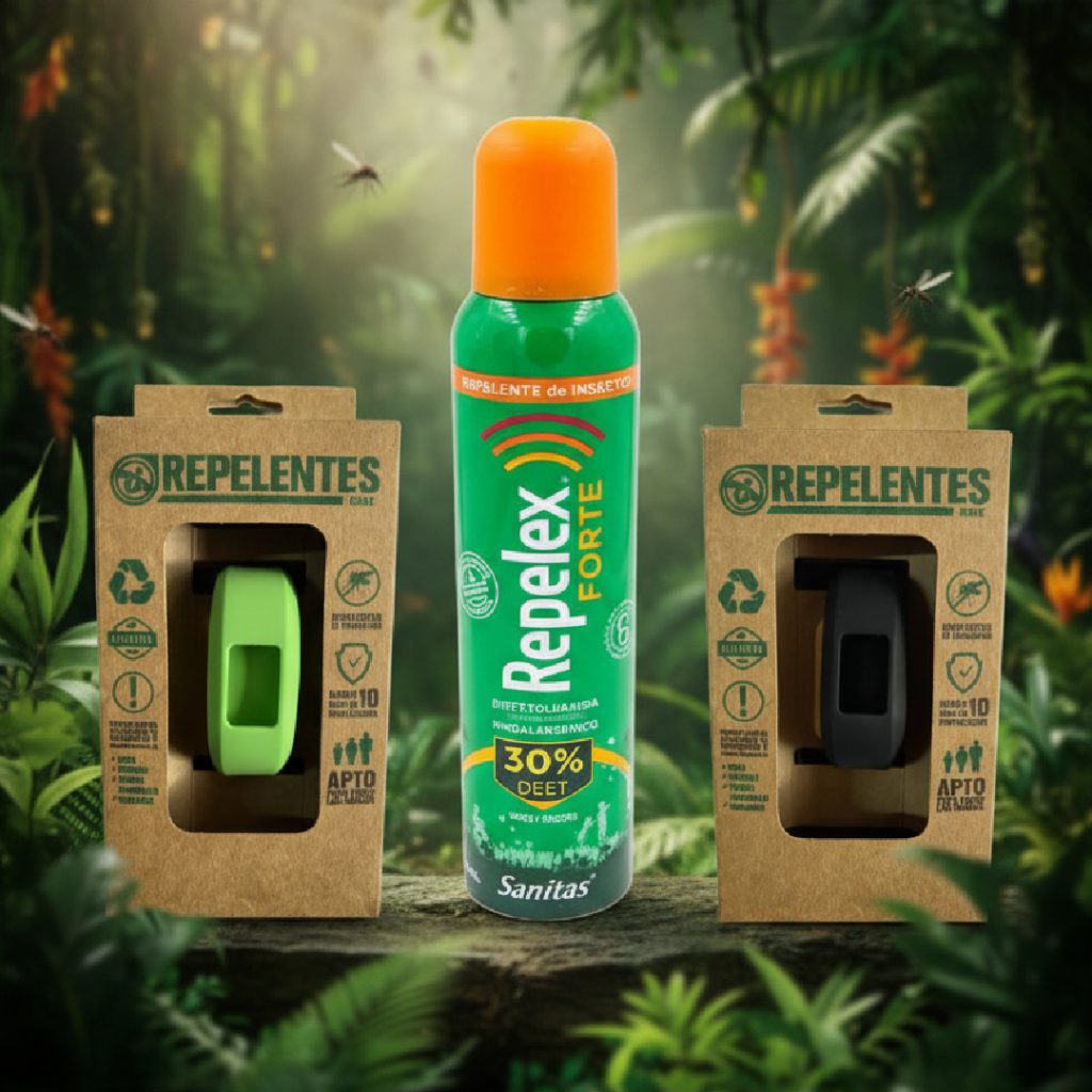 Kit repelente de mosquitos con protección de hasta 10 días. Incluye 2 pulseras repelentes modelo Outdoor y un repelente en spray 30% DEET, ideal para protegerte de enfermedades como Fiebre Amarilla, Zika, Dengue y Fiebre Amarilla.